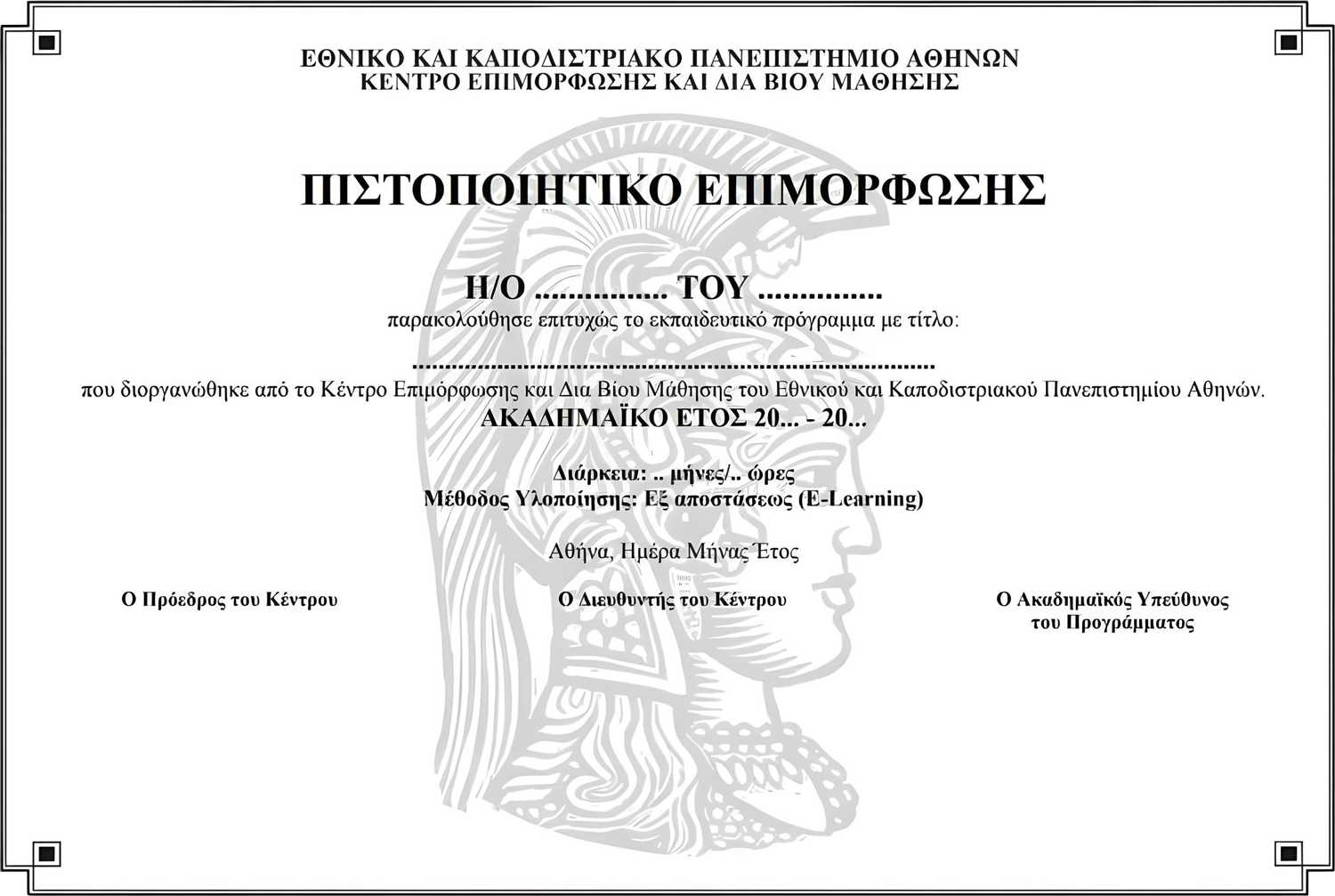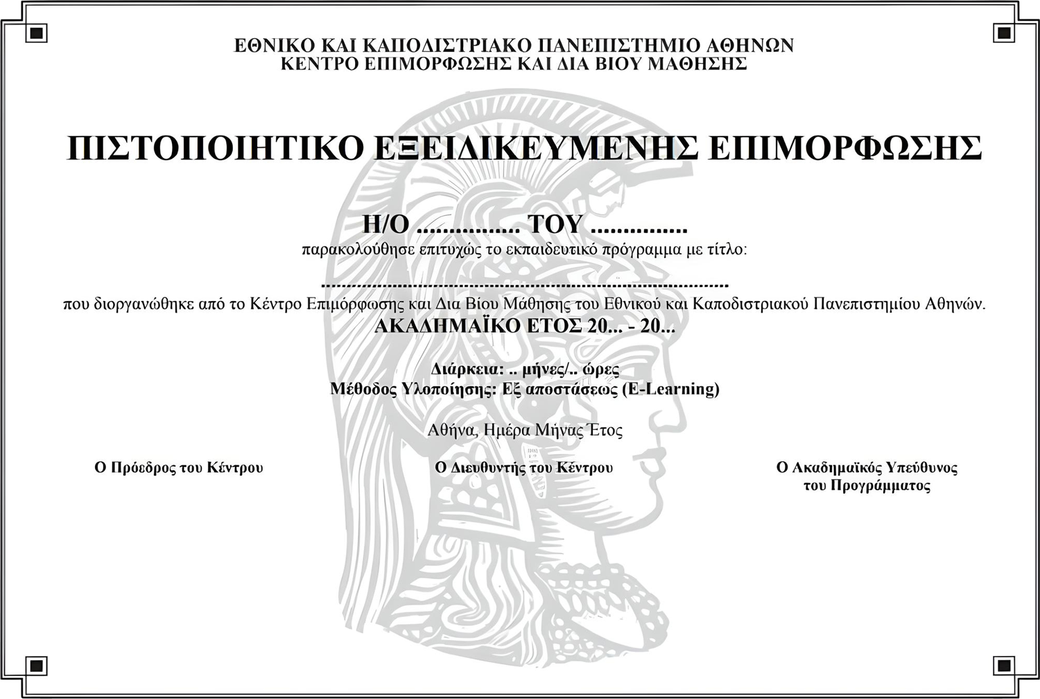 Η επιτυχής ολοκλήρωση του προγράμματος οδηγεί στην απονομή του σχετικού πιστοποιητικού στο οποίο αναγράφεται ο τίτλος, καθώς και ο ακριβής αριθμός ωρών επιμόρφωσης. Ανάλογα το πρόγραμμα, το Πιστοποιητικό που απονέμεται μπορεί να είναι: